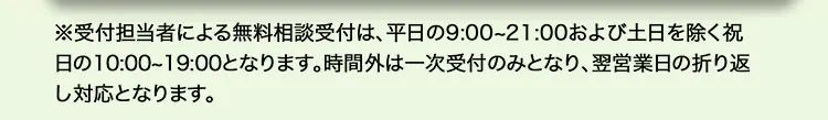 ※受付担当者による無料相談受付は、 平日の9:00~21:00 および土日を除く祝